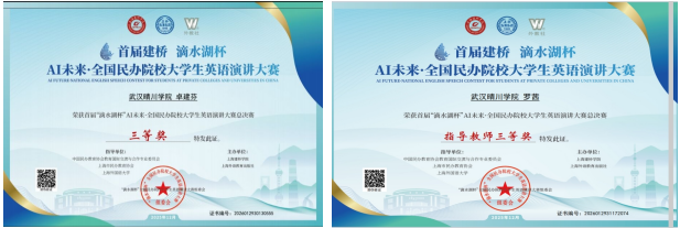 近日,首届“滴水湖杯”AI未来·全国民办院校大学生英语演讲大赛总决赛在上海建桥学院圆满落幕。武汉晴川学院设计工程学院2025级数字媒体艺术专业的卓建芬同学在外国语学院罗茜老师的指导下,凭借扎实的语言功底、出色的AI应用能力与深刻的主题表达,从全国80余所民办高校的万余名参赛选手中脱颖而出,斩获全国总决赛三等奖,为学校赢得荣誉。同时,罗茜老师获评大赛总决赛“指导老师三等奖”。