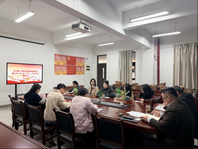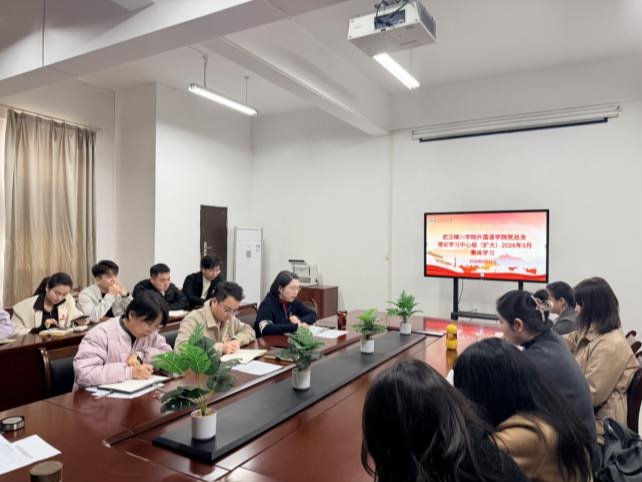 3月23日下午,外国语学院党总支理论学习中心组组织在综二413会议室开展2026年3月集体(扩大)学习。外国语学院党政领导班子、各支部书记、各系(部)负责人、全体辅导员老师参加。